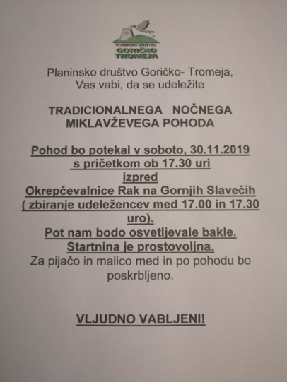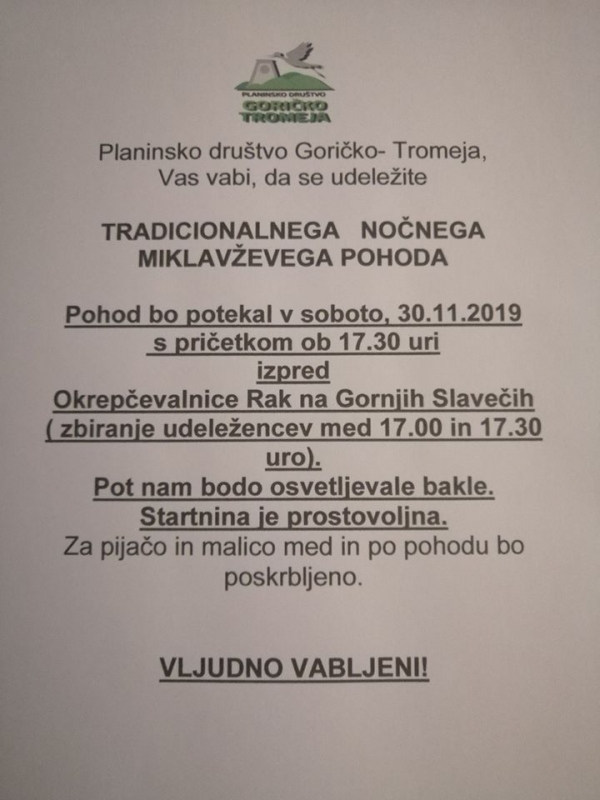 Planinsko društvo Tromeja, Gornji Slaveči vabi na tradicionalni nočni pohod v soboto 30. novembra. Pot bo osvetljena z baklami.