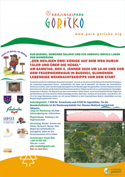 Zusammen werden wir entlang der Grenzsteine wandern, wo noch vor 31 Jahren ein Drahtzaun den Eisernen Vorhang an der slowenisch-ungarischen Grenze verdeutlichte. Die Natur hat es geschafft, die Wunden der menschlichen Intoleranz zu heilen, denn das ehemalige Sperrgebiet ist für Wanderungen wie geschaffen. Eine der Stationen wird am Grenzstein sein, der den nördlichsten Punkt Sloweniens markiert. Stärken werden wir uns am Rastplatz der ehemaligen Grenzwache in Budinci. Der Weg wird uns dann nach Andovci/Orfalu führen, wo wir beim Denkmal Kleiner Triglav von den Bewohnern des Ortes Andovci/Orfalu empfangen werden. Nach dem, wandern wir nach Süden, nach Budinci. Die 12,4 km lange Wanderung werden wir mit warmer Mahlzeit in dem Feuerwehrhaus Budinci abschließen und das Neujahrsbeginn gemeinsam feiern.