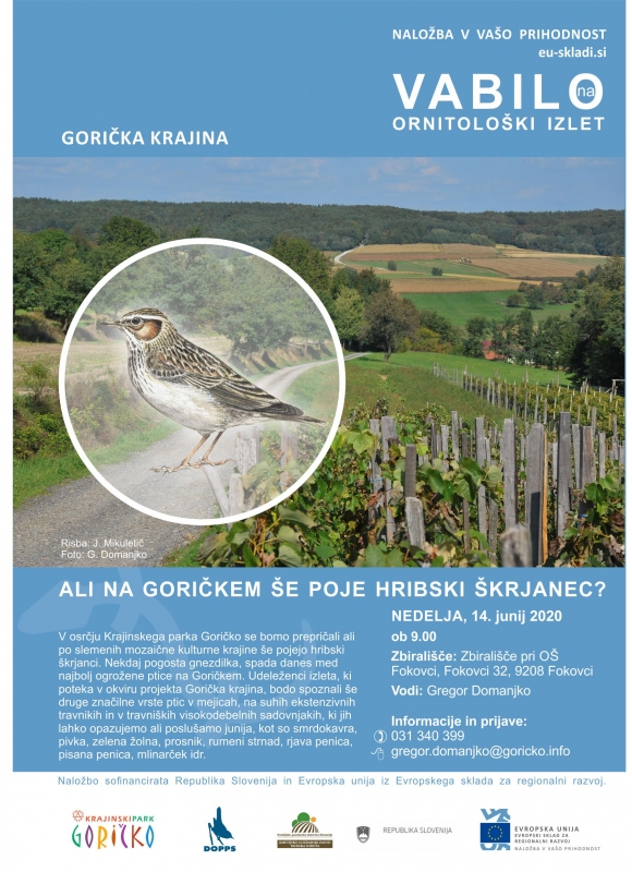 V osrčju Krajinskega parka Goričko se bomo prepričali ali po slemenih mozaične kulturne krajine še pojejo hribski škrjanci. Nekdaj pogosta gnezdilka, spada danes med najbolj ogrožene ptice na Goričkem. Udeleženci izleta, ki poteka v okviru projekta Gorička krajina, bodo spoznali še druge značilne vrste ptic v mejicah, na suhih ekstenzivnih travnikih in v travniških visokodebelnih sadovnjakih, ki jih lahko opazujemo ali poslušamo junija, kot so smrdokavra, pivka, zelena žolna, prosnik, rumeni strnad, rjava penica, pisana penica, mlinarček idr.