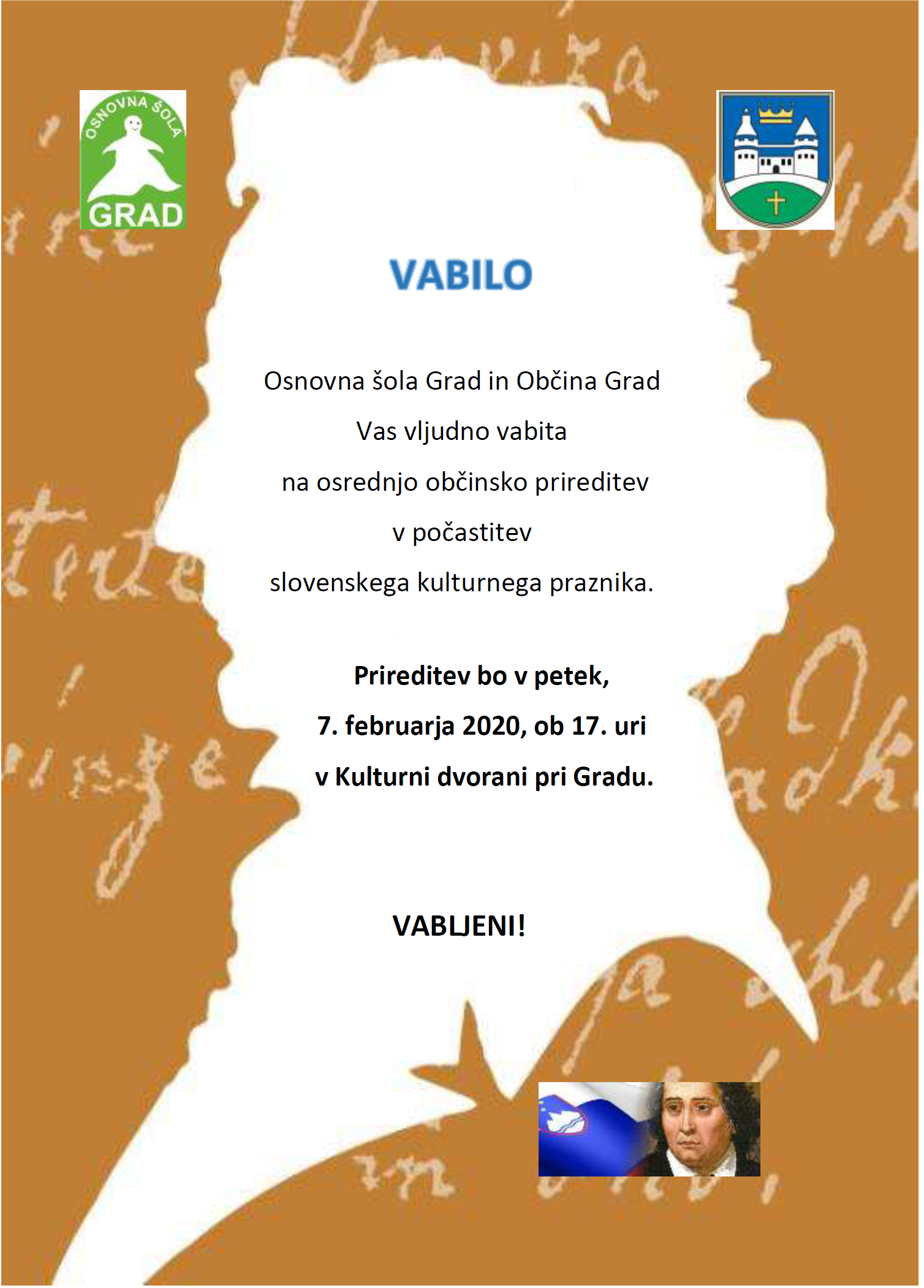 Osnovna šola Grad in Občina Grad Vas vljudno vabita na osrednjo občinsko prireditev v počastitev slovenskega kulturnega praznika.
