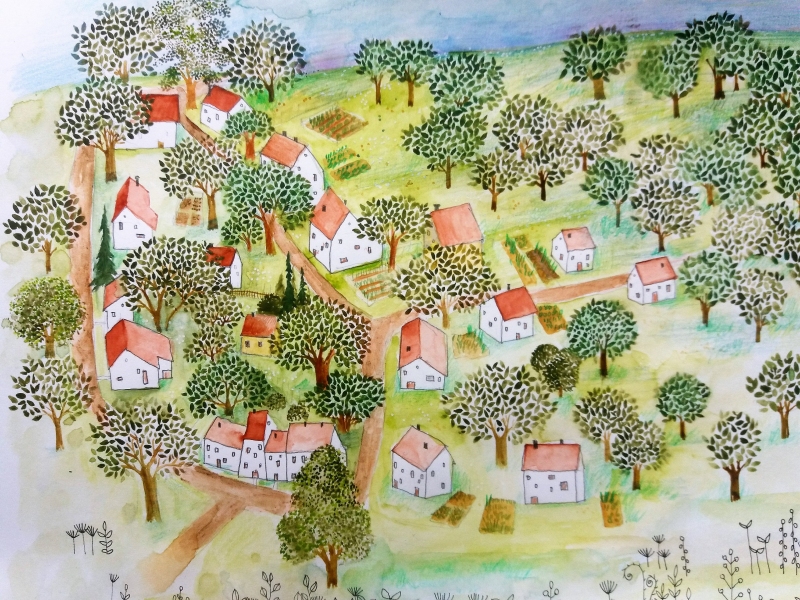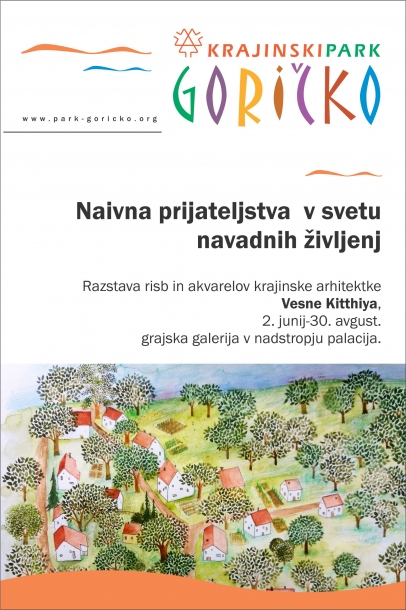 Krajinski park Goričko je kulturna krajina, kjer dele narave ohranjamo med njivami, ob potokih, v mejicah na travnikih, v starih sadovnjakih, skratka povsod tam, kjer raba tal ni prekomerna z uporabo strojev in kemičnih sredstev, ki se spirajo v potoke, v tla ali puhtijo v zrak. Seveda je odnos človeka do svojega življenjskega prostora in narave v njem tisti, ki oblikuje krajino, kakovost bivanja in našega zdravja. V razmislek o tem nagovarjajo risbe in akvareli Vesne Kitthiya v grajski galeriji z naslovom Naivna prijateljstva v svetu navadnih življenj. Zato vas še posebej v petek, 5.6.2020, vabimo k ogledu razstave v palacij gradu na Goričkem med 10.00 in 18.00. Razstava je na ogled do 30. avgusta po urniku za ogled gradu.