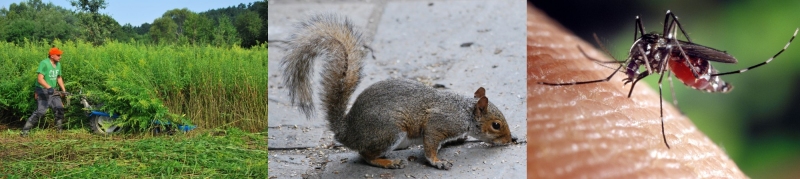 Orjaška zlata rozga povzroča škodo na travnikih; siva veverica že ogroža navadno veverico v Italiji in je vprašanje časa, kdaj se bo pojavila tudi pri nas; tigrasti komar lahko prenaša različne mrzlice (foto: G. Domanjko 1-2, Pixnio 3)