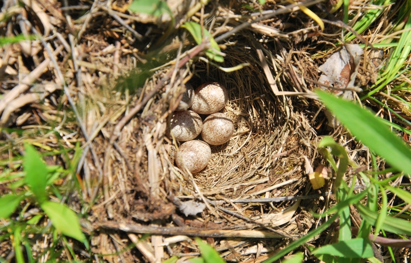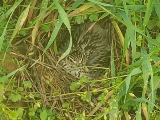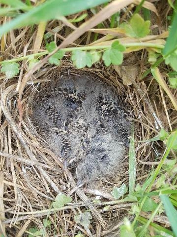 In both cases of the discovered nests, the Goričko Nature Park Public Institute contacted the owners, who were in favor of the protection of the species. The owner of the plowed field agreed to leave about 100 m2 around nest untouched. Unfortunately, the storm that raged in NE Slovenia at the beginning of May destroyed the nest, but we hope that the larks did make a replacement nest in the preserved area. The owner of a field with winter grain has also agreed not to cultivate the part of the field with a nest until the end of the nesting season. This nest experienced a real drama on the day of its discovery, as the owner accidentally ran over its outer edge with a tractor while spreading fertilizer, not yet knowing about the nest. Fortunately, the eggs survived, and the female even layed another egg next day, laying four eggs in mid-May.