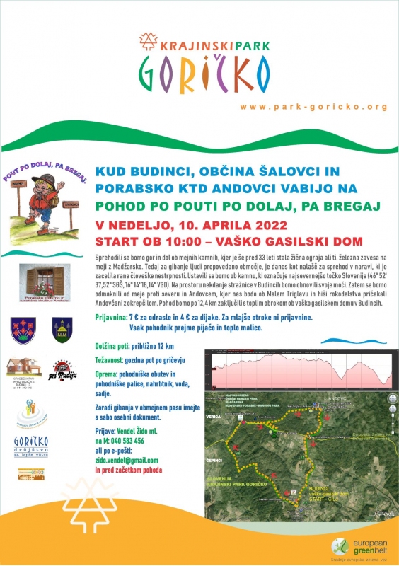 Sprehodili se bomo gor in dol ob mejnih kamnih, kjer je še pred 33 leti stala žična ograja ali ti. železna zavesa na meji z Madžarsko. Tedaj za gibanje ljudi prepovedano območje, je danes kot nalašč za sprehod v naravi, ki je zacelila rane človeške nestrpnosti. Ustavili se bomo ob kamnu, ki označuje najsevernejšo točko Slovenije (46° 52 37,52" SGŠ, 16° 14 18,14" VGD). Na prostoru nekdanje stražnice v Budincih bomo obnovili svoje moči. Zatem se bomo odmaknili od meje proti severu in Andovcem, kjer nas bodo ob Malem Triglavu in hiši rokodelstva pričakali Andovčani z okrepčilom. Pohod bomo po 12,4 km zaključili s toplim obrokom ob vaško gasilskem domu v Budincih.