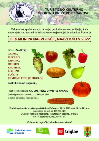 Turistično kulturno športno društvo Pečarovci vabi vse poljedelce, vrtičkarje, ljubitelje narave, sadjarje, da sodelujejo na razstavi in tekmovanju najkmetijskih pridelkov Pomurja