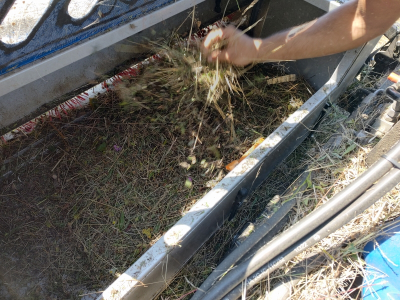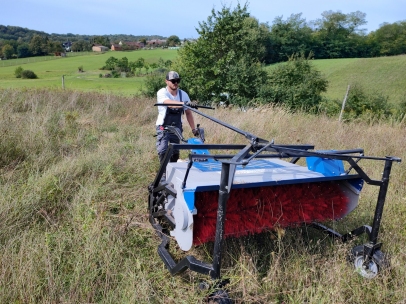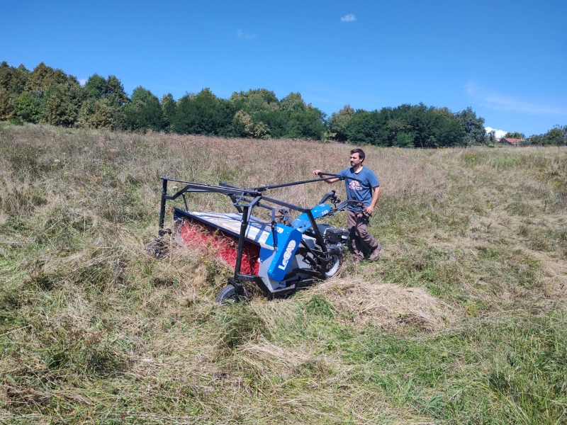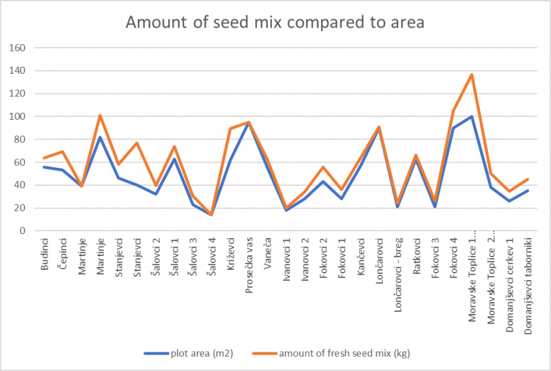 In the past two months, the LIFE FOR SEEDS project has been intensively collecting seed mixtures in dry orchid meadows of habitat type 6210 (*). The action was carried out to restore species-poorer meadows of the same habitat type. The seed mixtures were harvested using a brush machine designed by the Faculty of Mechanical Engineering in Ljubljana, based on the experience of the Agricultural Research and Training Centre Raumberg - Gumpenstein (Austria) and the specifications of the Agricultural Institute of Slovenia. The brushcutter was attached to a shear mower to ensure the survival of as many small grassland animals as possible (grasshoppers, blackbirds, butterflies, praying mantises, etc. ), while at the same time collecting as much seed material as possible. We mechanically mowed the planned 12 ha or 27 meadows of habitat type 6210 (*) and harvested just over 280 kg of fresh seed material, which we transported to Grad Castle. We brushed the meadows on two dates to get seeds from as many different grassland plants as possible, as they do not all set seed at the same time. This ensures the biodiversity of the meadow seed mix, which includes a variety of fescues, foxglove, little starchweed, true starvation, several species of cloves, purple loosestrife, rock foxglove, common purslane, crested wheatgrass, medium-sized thistle, common thistle, and many others. At the same time, it was important that the meadows themselves were not mown by the time the seed mixes were harvested, as this was the only way to harvest seeds from more plants, especially those that flower later in the season. The figure below shows the amount of seed mix collected compared to the area of the meadow. The area of the meadow and the amount of seed material are correlated - more seed material was collected in larger meadows.