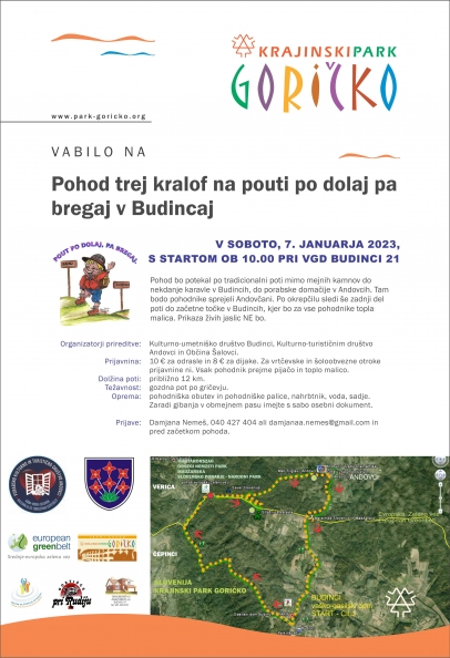 Kulturno-umetniško društvo Budinci v sodelovanju s porabskim Kulturno-turističnim društvom Andovci in Občino Šalovci prireja tradicionalni pohod trej kralof na pouti po dolaj pa bregaj. Pot bo vodila od vaško-gasilskega doma Budinci (Budinci 21) skozi gozd in mimo mejnih kamnov do mesta, kjer je nekoč v Budincih stala karavla. Po krajšem postanku sledi pot čez mejo v Porabje, kjer bodo pohodnike v Andovcih pri malem Triglavu pričakali domačini. Po okrepčilu sledi še zadnji del poti do začetne točke pohoda v Budincih, kjer bo topla malica. Zaradi gibanja v obmejnem pasu imejte s sabo osebni dokument.