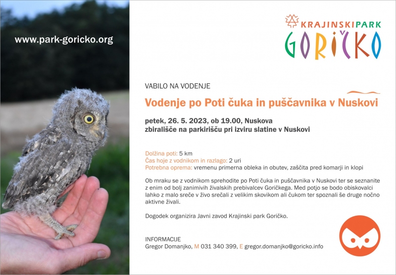 Ob mraku se z vodnikom sprehodite po Poti čuka in puščavnika v Nuskovi ter se seznanite z enim od bolj zanimivih živalskih prebivalcev Goričkega. Med potjo se bodo obiskovalci lahko z malo sreče v živo srečali z velikim skovikom ali čukom ter spoznali še druge nočno aktivne živali.