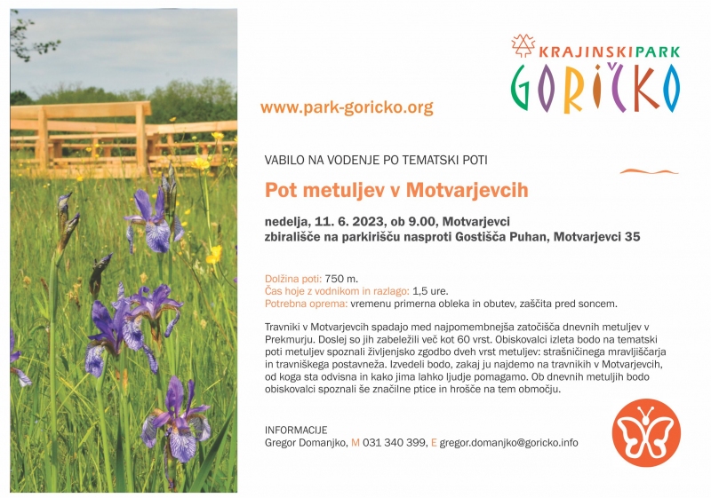 Travniki v Motvarjevcih spadajo med najpomembnejša zatočišča dnevnih metuljev v Prekmurju. Doslej so jih zabeležili več kot 60 vrst. Obiskovalci izleta bodo na tematski poti metuljev spoznali življenjsko zgodbo dveh vrst metuljev: strašničinega mravljiščarja in travniškega postavneža. Izvedeli bodo, zakaj ju najdemo na travnikih v Motvarjevcih, od koga sta odvisna in kako jima lahko ljudje pomagamo. Ob dnevnih metuljih bodo obiskovalci spoznali še značilne ptice in hrošče na tem območju.