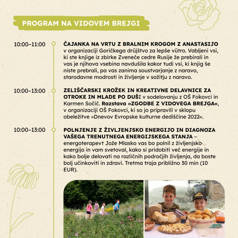 ZELIŠČARSKI KROŽEK IN KREATIVNE DELAVNICE ZA OTROKE IN MLADE PO DUŠI v sodelovanju z OŠ Fokovci in Karmen Sočič. Razstava »ZGODBE Z VIDOVEGA BREJGA«, v organizaciji OŠ Fokovci, ki so jo pripravili v sklopu obeležitve »Dnevov Evropske kulturne dediščine 2022«.