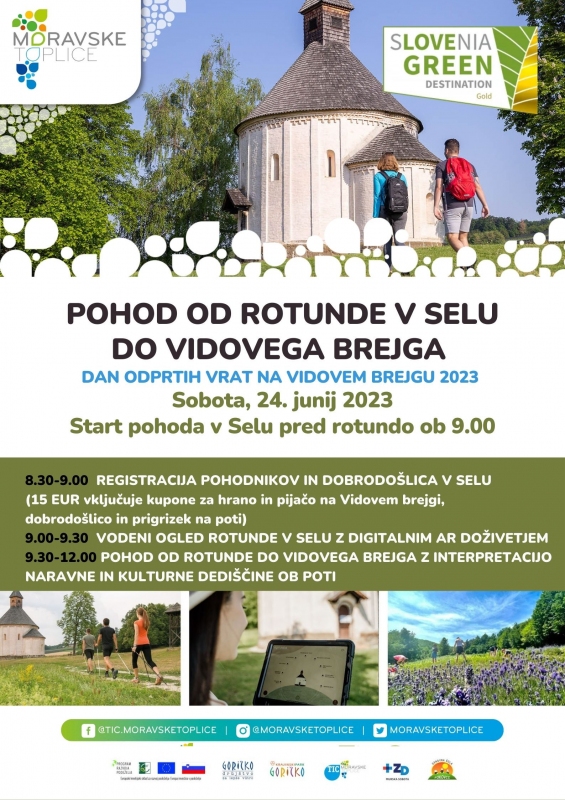 POHOD OD ROTUNDE DO VIDOVEGA BREJGA Z INTERPRETACIJO NARAVNE IN KULTURNE DEDIŠČINE OB POTI, v organizaciji TIC Moravske Toplice in Javnega zavoda Krajinski park Goričko na Vidov brejg, kjer se bodo pohodniki pridružili ostalim obiskovalcem v kulinaričnem uživanju in drugih aktivnostih. Vsak pohodnik se lahko individualno odpravi na zadnji del poti nazaj do izhodiščne točke pri Rotundi (cca 30 min).