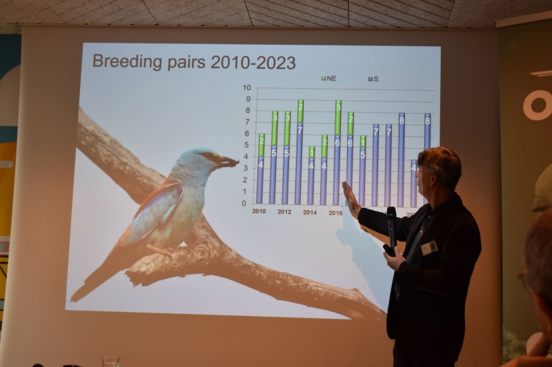 Na žalost število gnezdečih parov zlatovranke še naprej stagnira ali upada. V Črni Gori tako gnezdi 14 parov, v Latviji 13, v Litvi 8, na Poljskem 5 in v Avstriji samo 2 para zlatovrank. Stanje zlatovranke v Sloveniji je predstavil Gregor Domanjko iz JZ KPG. Povedal je, da je zlatovranka v Sloveniji izumrla, čeprav je bilo od leta 2014, od kar je zadnjič gnezdila v dolini reke Ledave na Goričkem, več kot 25 opazovanj po različnih delih Slovenije. Gnezdenja žal ni bilo mogoče potrditi. Predstavil je različne ukrepe, ki so jih v zadnjih 8 letih izvedli na Goričkem za izboljšanje stanja ohranjenosti ptic kmetijske krajine. Več o ukrepih tukaj.