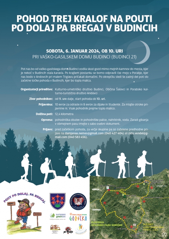 Prijave: pred začetkom pohoda, za večje skupine pa so zaželene predhodne prijave na damjanaa.nemes@gmail.com (040 427 404) ali zido.vendel@gmail.com (040 583 456).