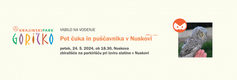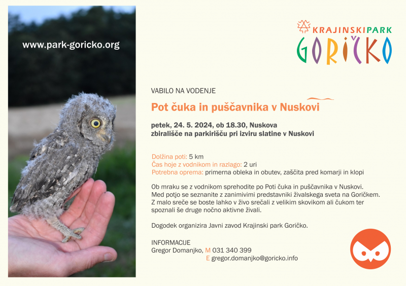 Ob mraku se z vodnikom sprehodite po Poti čuka in puščavnika v Nuskovi ter se seznanite z enim od bolj zanimivih živalskih prebivalcev Goričkega. Med potjo se bodo obiskovalci lahko z malo sreče v živo srečali z velikim skovikom ali čukom ter spoznali še druge nočno aktivne živali.