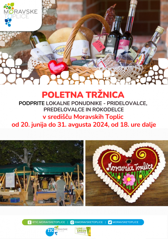 Na poletni turistični tržnici vas pričakuje ponudba rokodelskih izdelkov, ki nosijo certifikat art craft in nagrajenih živilskih proizvodov iz podeželskih kmetij. In še mnogo drugih izdelkov, ki so lahko imenitno darilo za vaše najdražje ali dragocen osebni spominek iz Prekmurja!