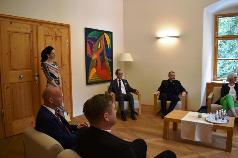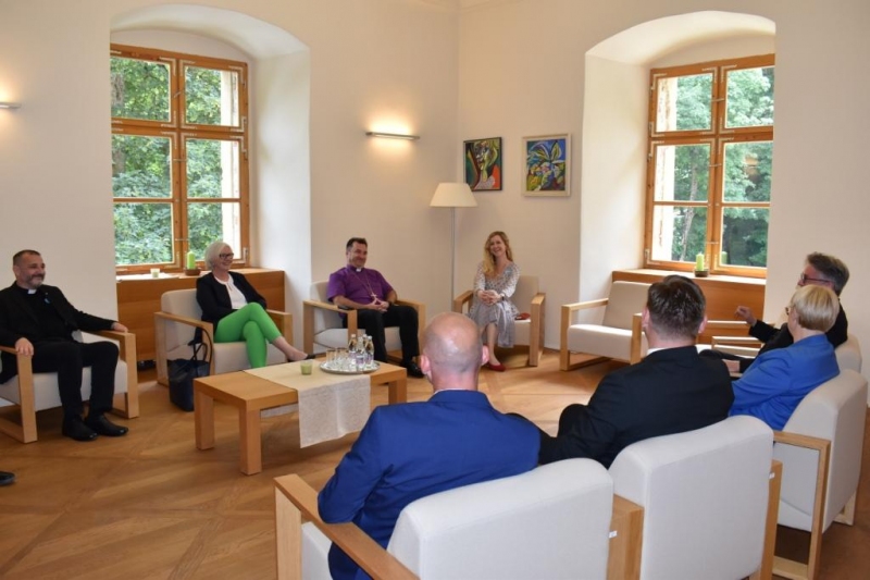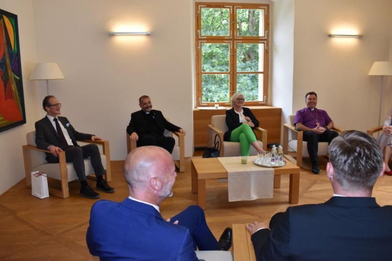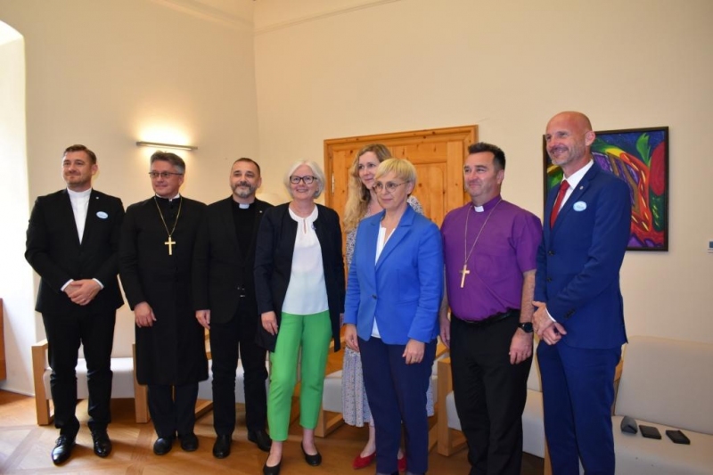 Srečanje in pogovori s predsednico RS dr. Natašo Pirc Musar so se nadaljevali v prostorih gradu, kjer se je pogovorila z duhovnicami in duhovniki Evangeličanske cerkve v Sloveniji s škofom mag. Leonom Novakom, inšpektorjem Evangeličanske cerkve Bojanom Prosičem ter s predsednikom EHO-Podpornice mag. Petrom Andrejčákom. Sledil je pogovor z župani, predstavniki Civilne zaščite, Slovenske policije, Slovenske vojske, Gasilske zveze, Karitasa, bolnišnice v M. Soboti, skratka z ljudmi, ki sodelujejo z EHO PODPORNICO v kriznih razmerah in pri naravnih katastrofah. Posebno zahvalo EHO Podpornici je izrekel župan Občine Gornji Grad, g. Anton Špeh, saj je EHO Podpornica v ujmi leta 2024 prva priskočila njihovim občanom na pomoč. Zaključni pogovor predsednice je bil z gosti iz tujine in sicer s predsednico Sinode Evangeličanske deželne cerkve v Württembergu, Sabino Foth, veleposlanico ZRN Natalie Kauther, škofom Slovaške evangeličanske cerkve AV v Vojvodini, dr. Jaroslavom Javornikom iz Vojvodine in predstavnikom Evangeličanske cerkve na Hrvaškem, duhovnikom Samuelom Vrabcem.