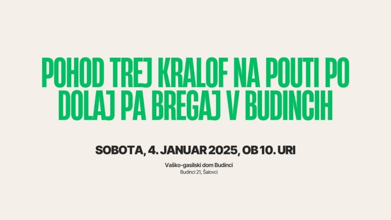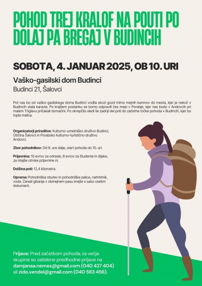 Vljudno vabljeni na pohod v Budince. Pot vas bo od vaško-gasilskega doma Budinci vodila skozi gozd mimo mejnih kamnov do mesta, kjer je nekoč v Budincih stala karavla. Po krajšem postanku se boste odpravili čez mejo v Porabje, kjer vas bodo v Andovcih pri malem Triglavu pričakali domačini. Po okrepčilu sledi še zadnji del poti do začetne točke pohoda v Budincih, kjer bo topla malica.