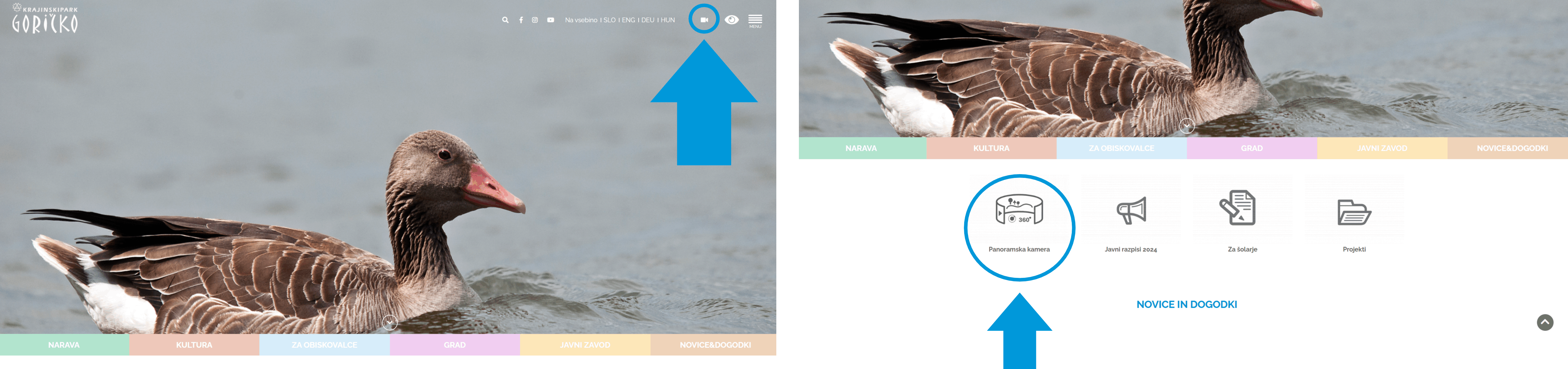On our website, you can access the webcam by clicking on the camera icon in the upper right corner of the homepage (image 1) and on the icon (image 2).