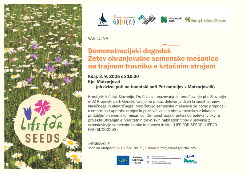 Kmetijski inštitut Slovenije, Društvo za opazovanje in proučevanje ptic Slovenije in JZ Krajinski park Goričko vabijo na prikaz delovanja dveh krtačnih strojev: klasičnega in električnega. Med žetvijo semenske mešanice se bomo prepričali o smotrnosti uporabe strojev in pozitivih vidikih obnov travnikov z lokalno pridobljeno semensko mešanico. Demonstracijski prikaz bo potekal v okviru projekta Ohranjanje prioritetnih travniških habitatnih tipov v Sloveniji z vzpostavitvijo semenske banke in obnovo in situ (LIFE FOR SEEDS (LIFE20 NAT/SI/000253).
