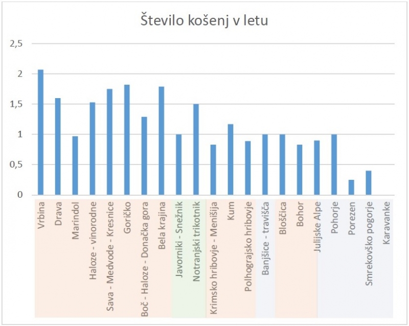 Kmetje kosijo svoje travnike glede na potrebe: ali zaradi pridobivanja krme ali pa da jih počistijo in zajezijo zaraščanje. Zelo pomemben dejavnik je tudi lega travnika, kajti le-ta narekuje kolikšna biomasa bo zrasla. Na Goričkem kmetje kosijo svoje travnike povečini 1 do 2-kat na letno, enako povečini tudi po ostalem delu države. Čas košnje pa variira vse od sredine maja do konca septembra, kar je seveda največ odvisno od nadmorske višine travnika.