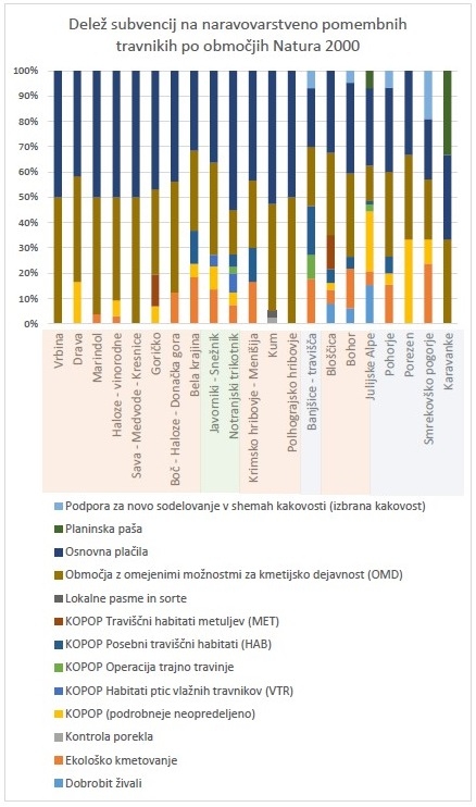Zadnja slika prikazuje deleže subvencij, v katere so vključeni slovenski kmetje s svojimi naravovarstveno pomembnimi travniki. Travniki so vključeni med osnovna plačila, območja z omejenimi možnostmi za kmetijsko dejavnost in izbranimi KOPOP ukrepi, pri čemer na Goričkem prevladuje KOPOP ukrep Traviščni habitati metuljev (MET).
